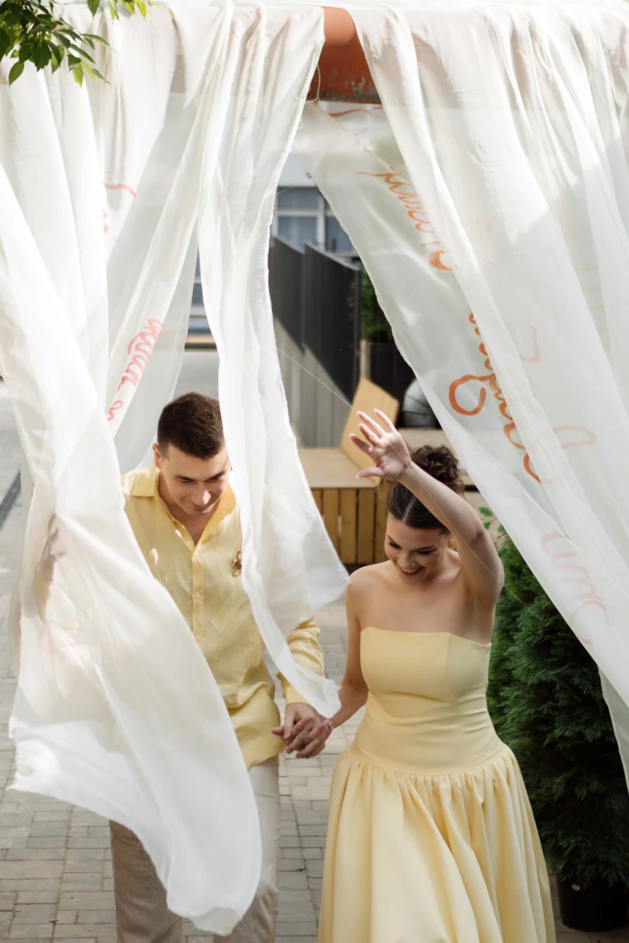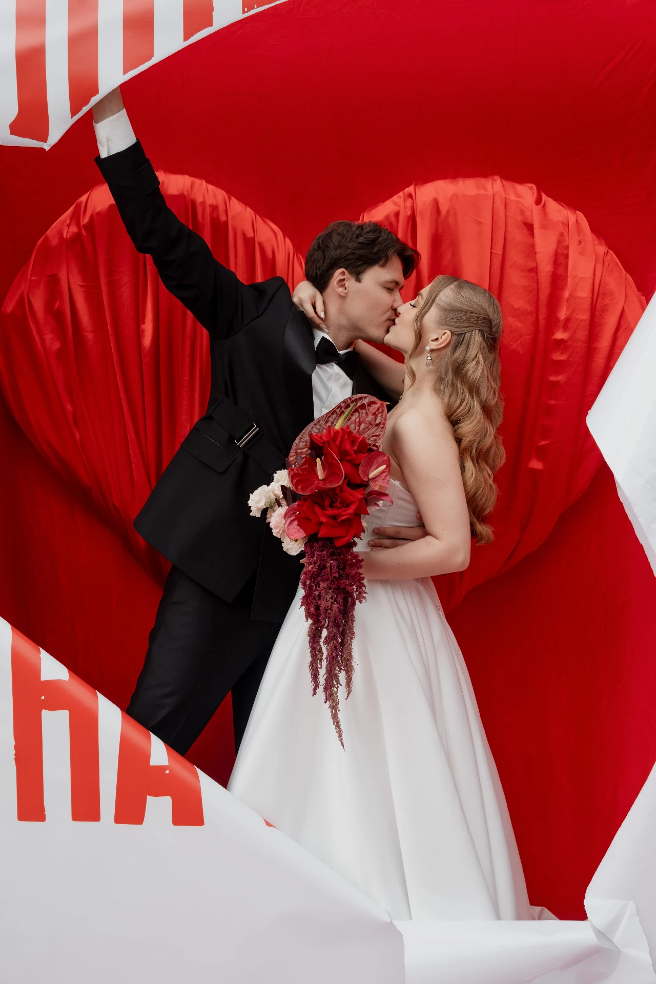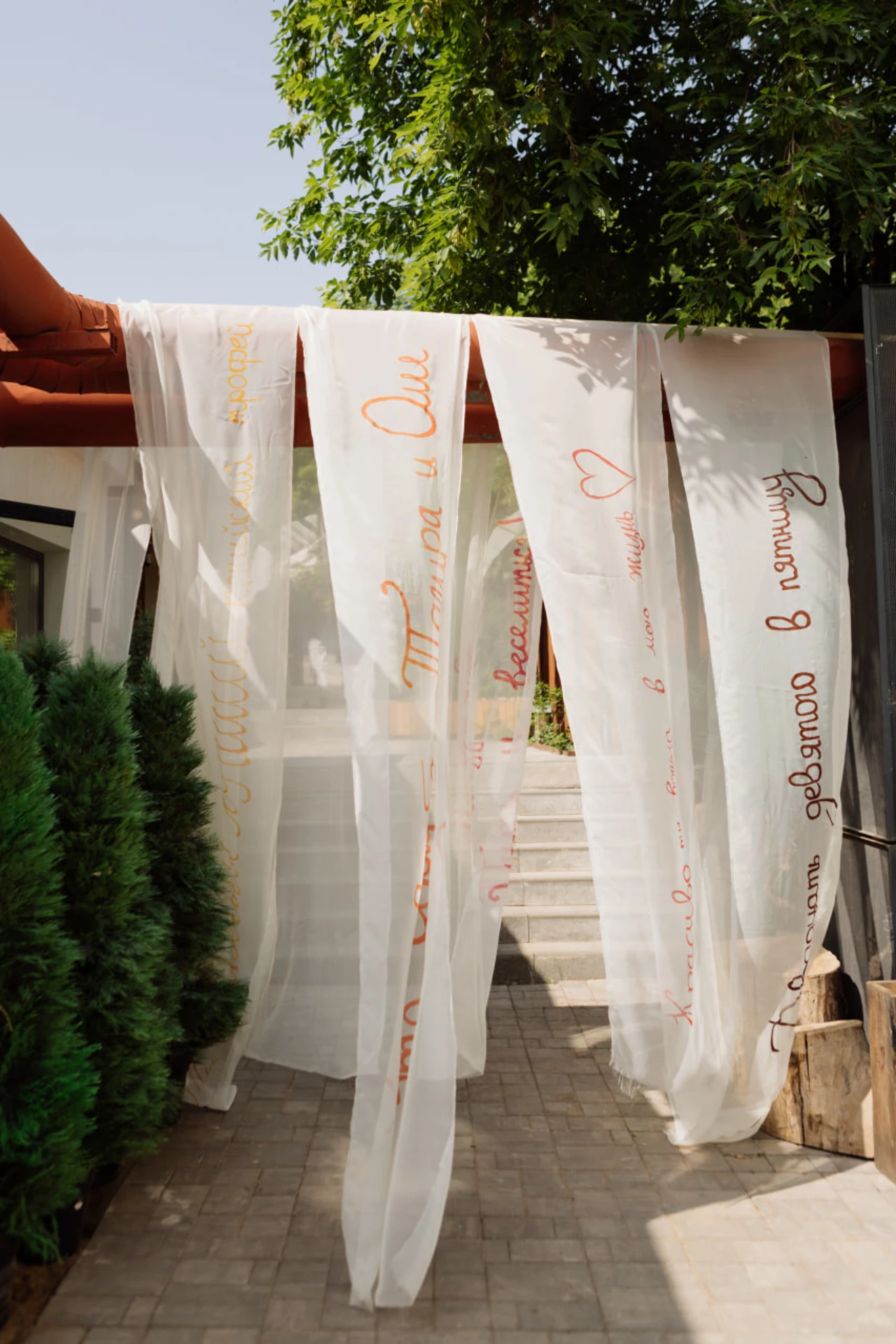 Особенно нам понравилась яркая палитра оформления, которая точно передала наш характер и творческий взгляд на жизнь. Отдельно хочется отметить зону церемонии: украшение с важной для нас фразой. Ааа, мы разорвали этот плакат!!! И показали спрятанное за ним большое сердце.