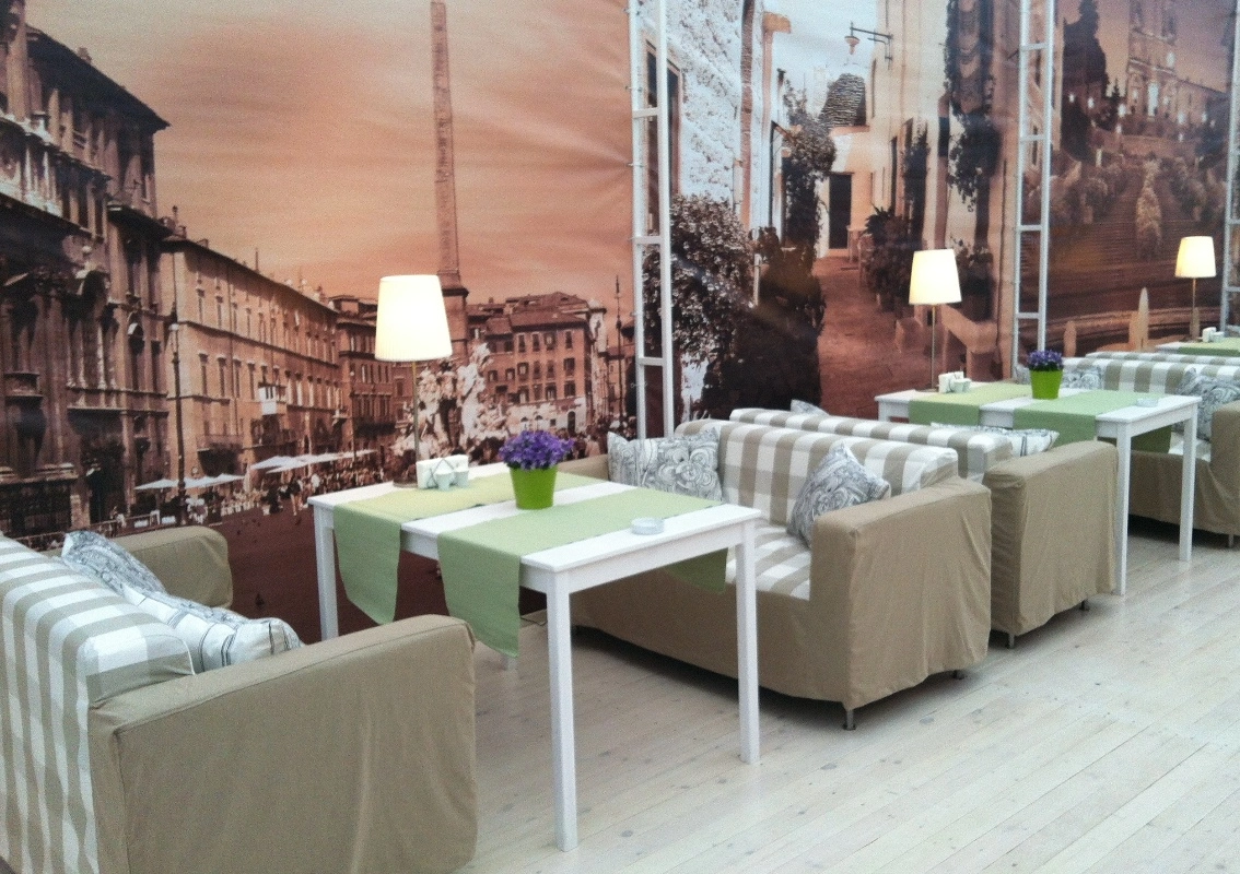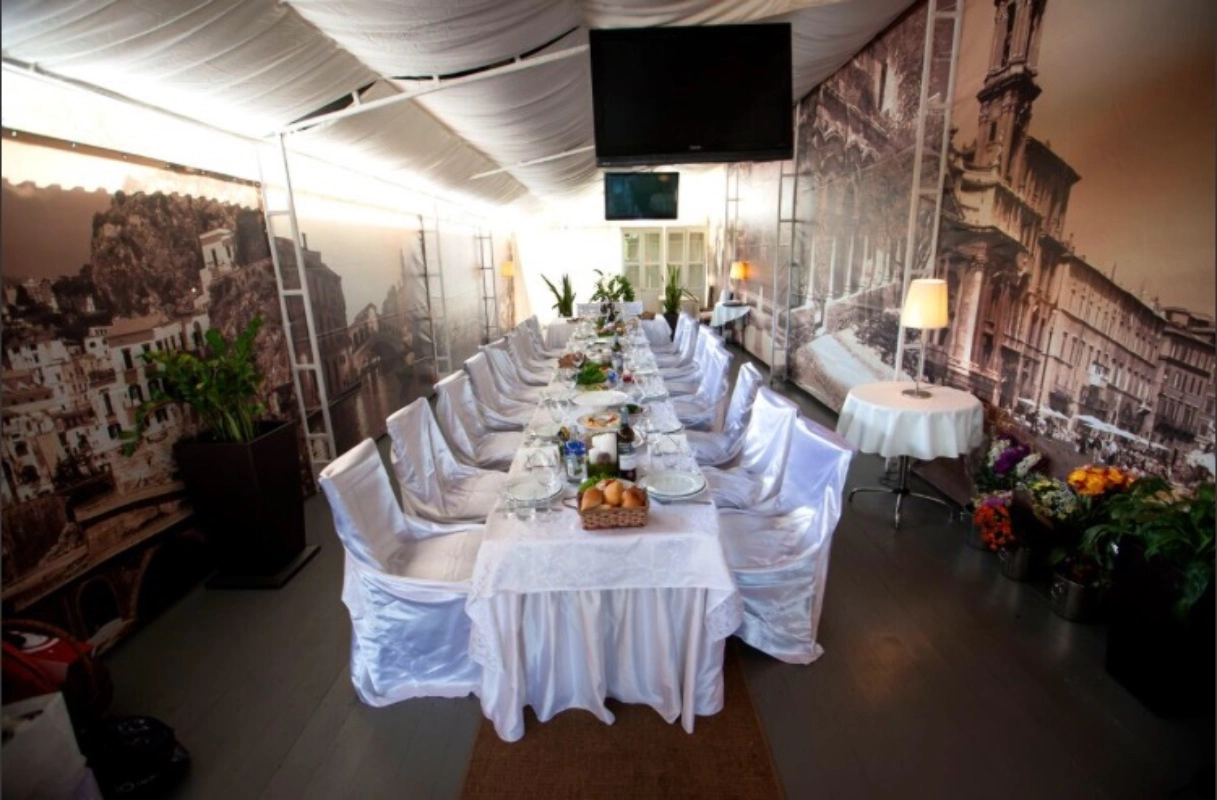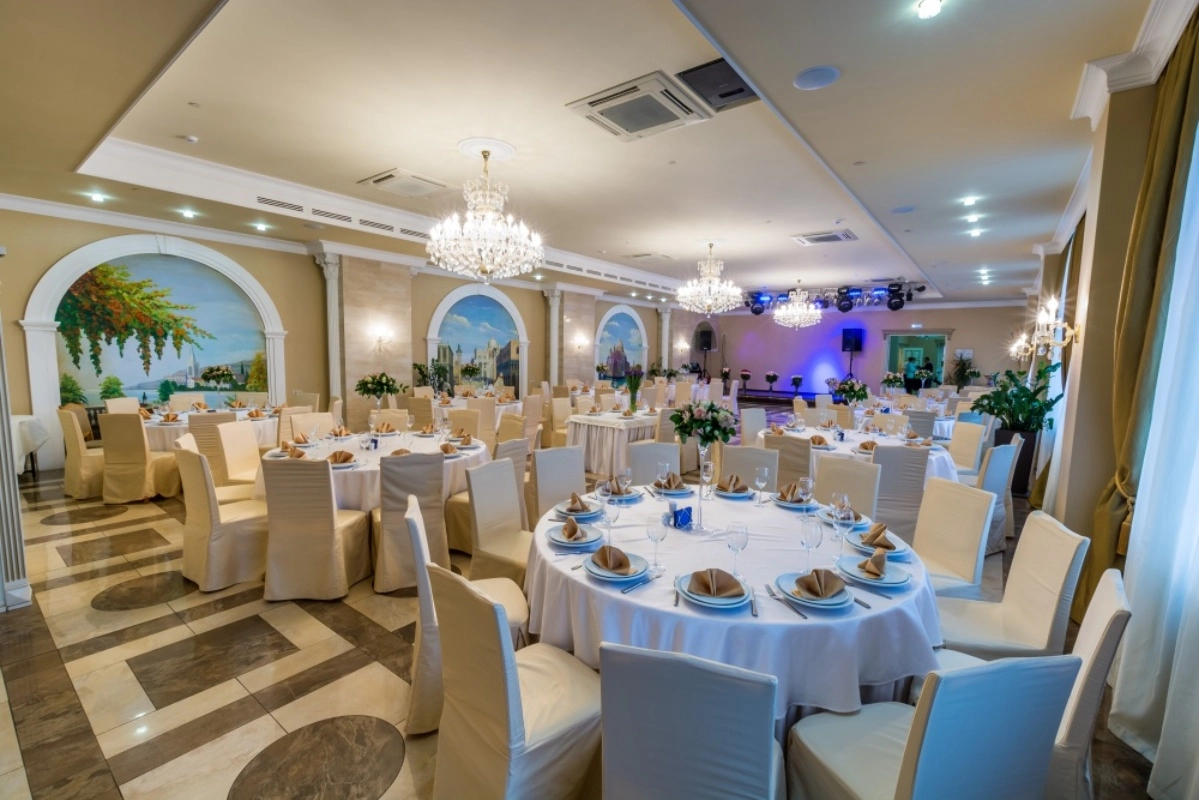 Интерьер нашего основного зала Венеция на 140 гостей выполнен в дворцовом итальянском стиле. В зале есть небольшая сцена или подиум с оборудованием, есть проектор с экраном. Возможна живая музыка по заказу на банкет, в определенные дни проводятся выступления от ресторана. Можно заказать декор зала по вашему вкусу.