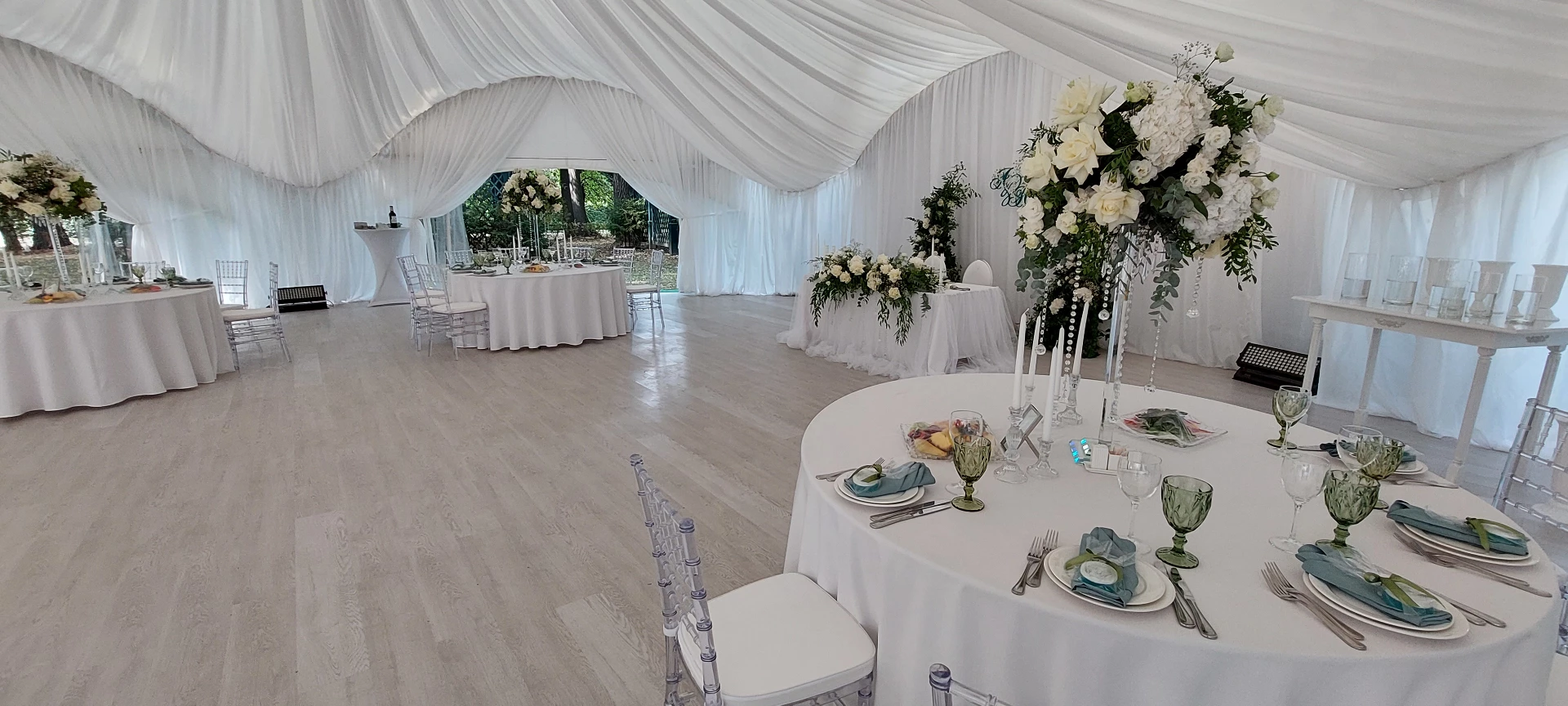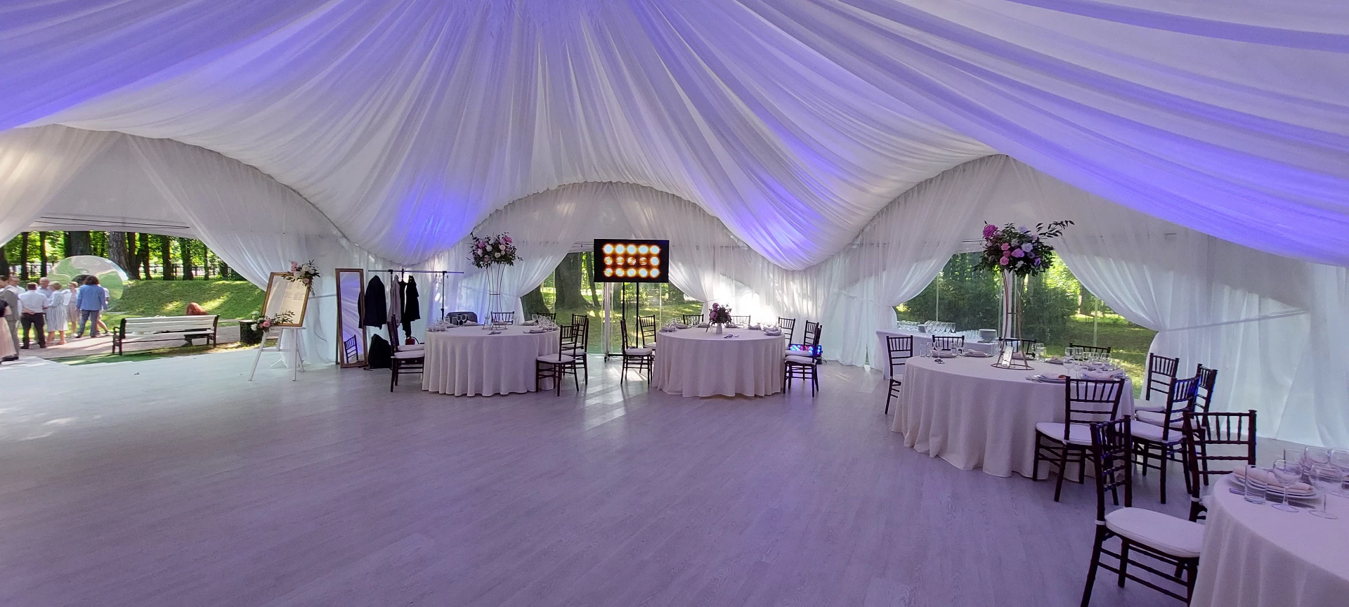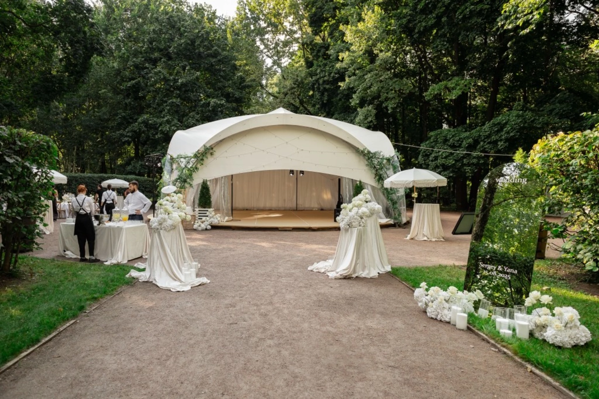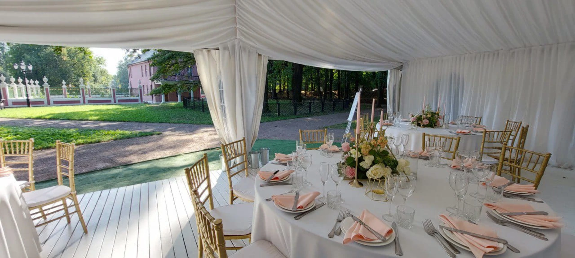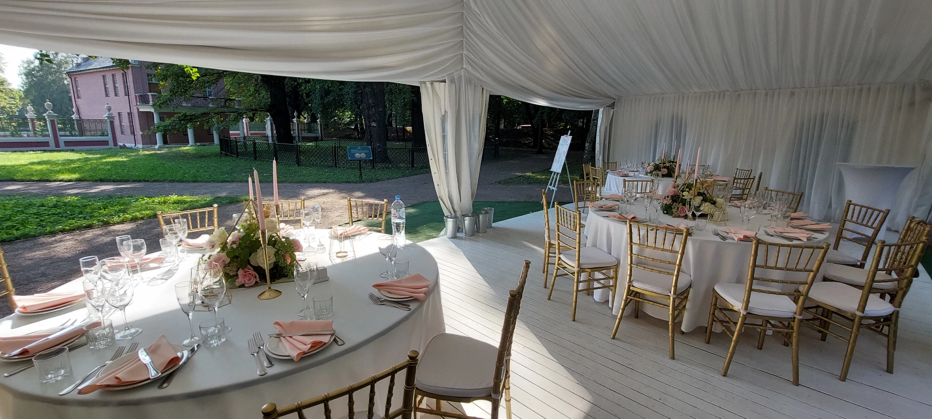 Свадьба проходила в шатре с видом на дворец. Безумно красивый шатёр, все в тканях, в белом цвете, воздушное нежное, огромная зелёная территория, все было чудесно и вкусно! Спасибо огромное