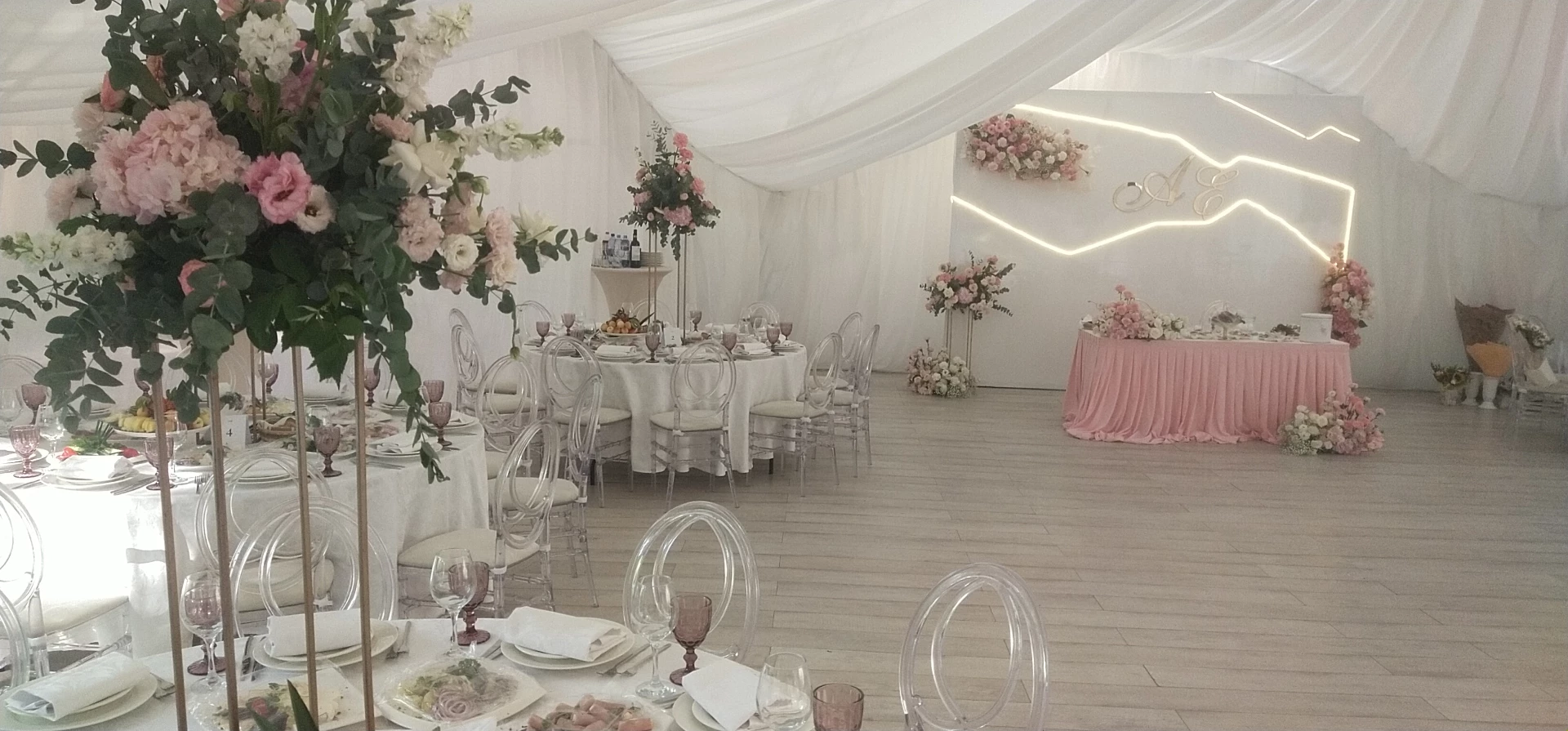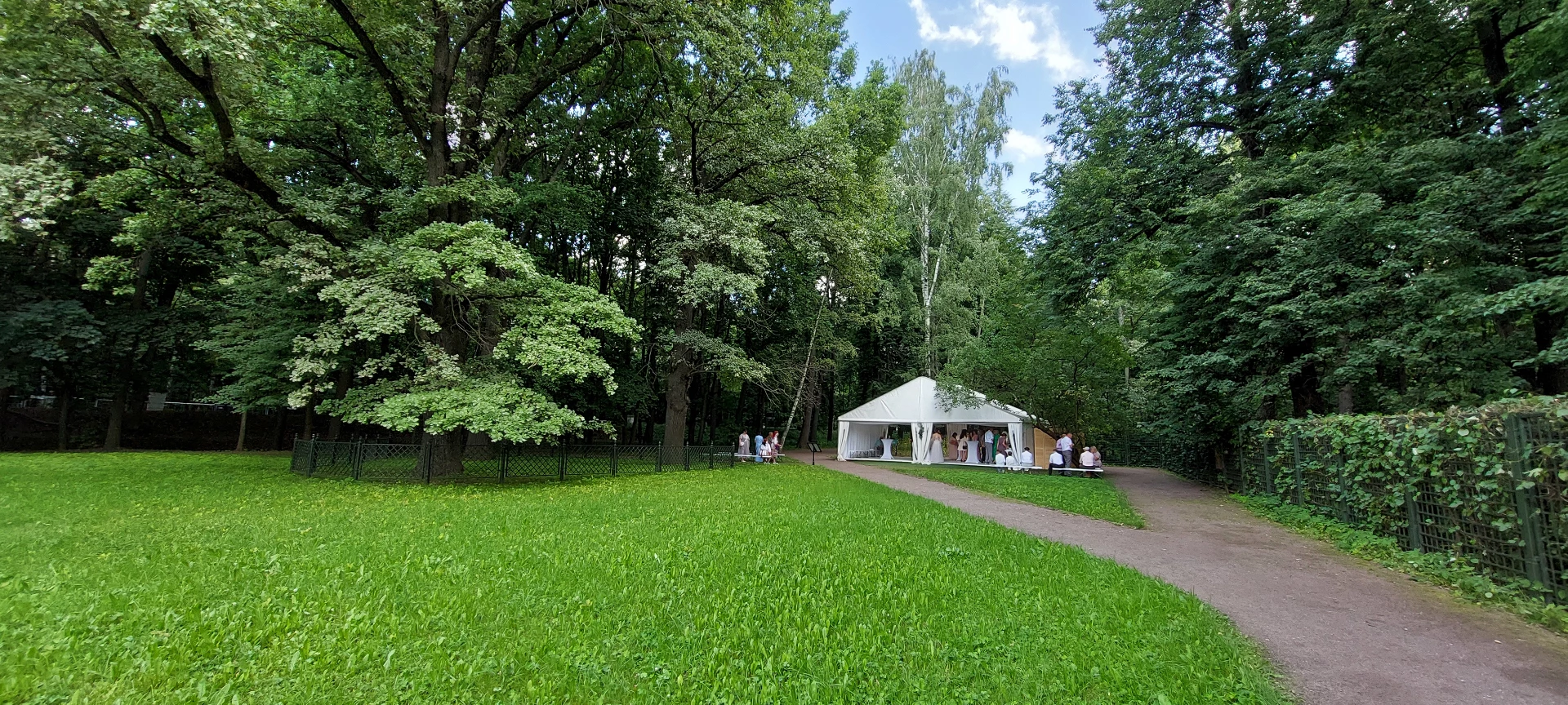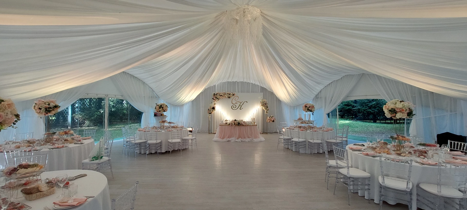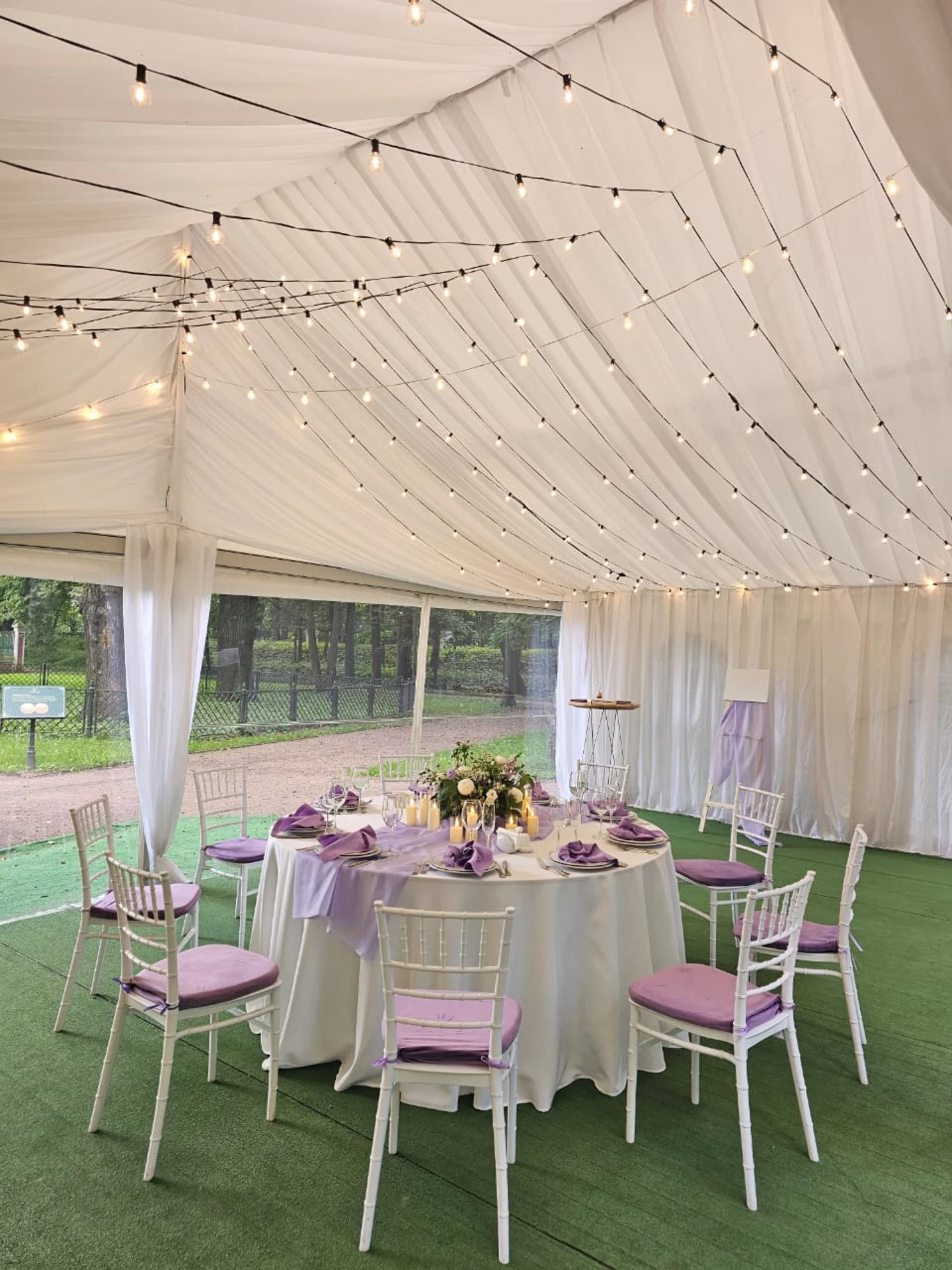 Свадьба проходила в шатре с видом на дворец. Безумно красивый шатёр, все в тканях, в белом цвете, воздушное нежное, огромная зелёная территория, все было чудесно и вкусно! Спасибо огромное