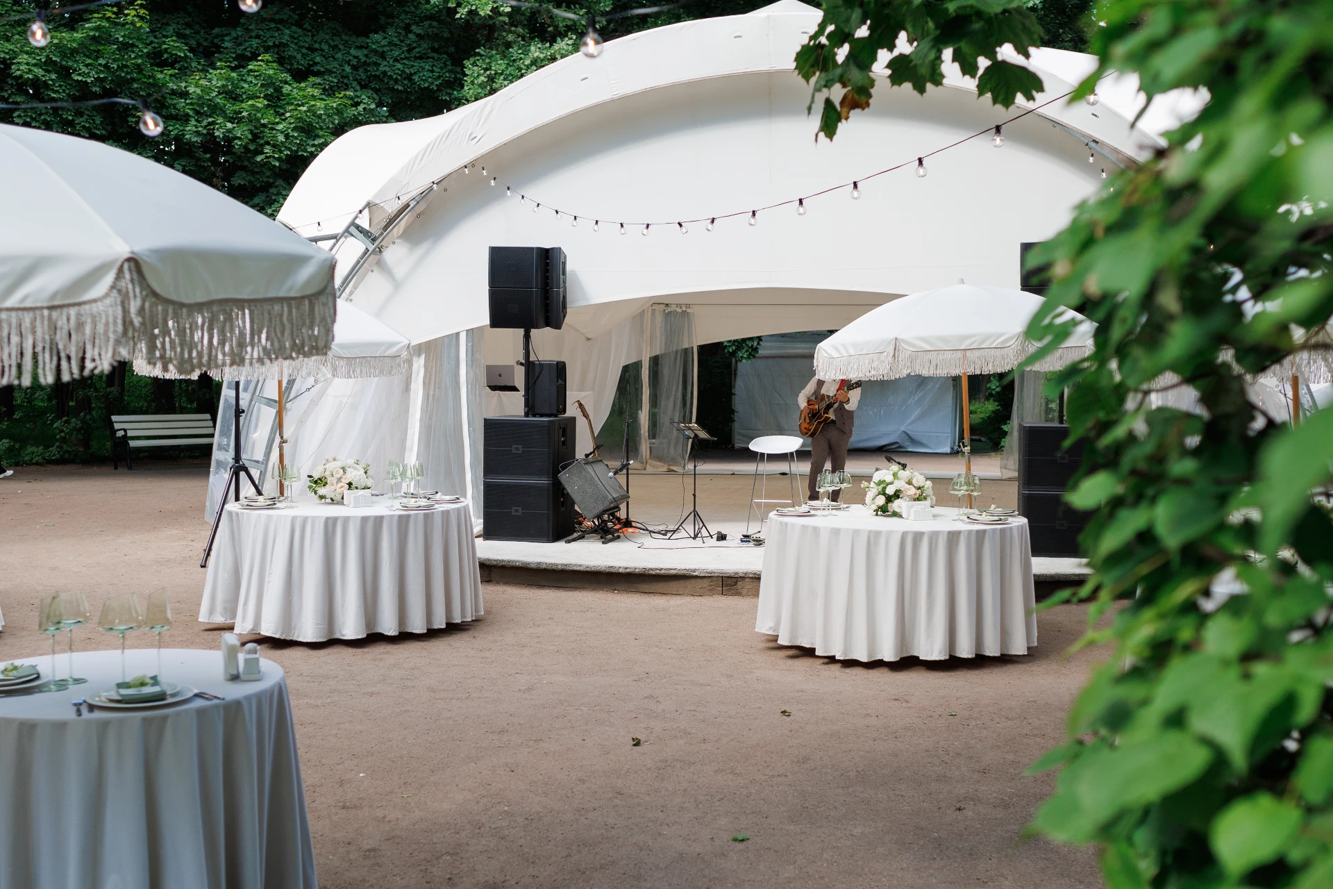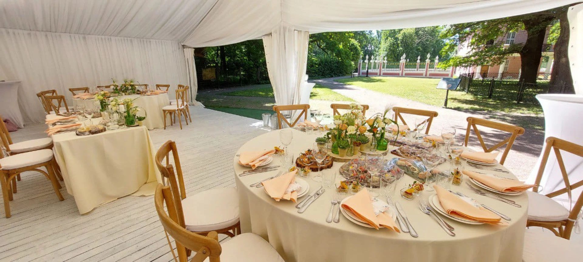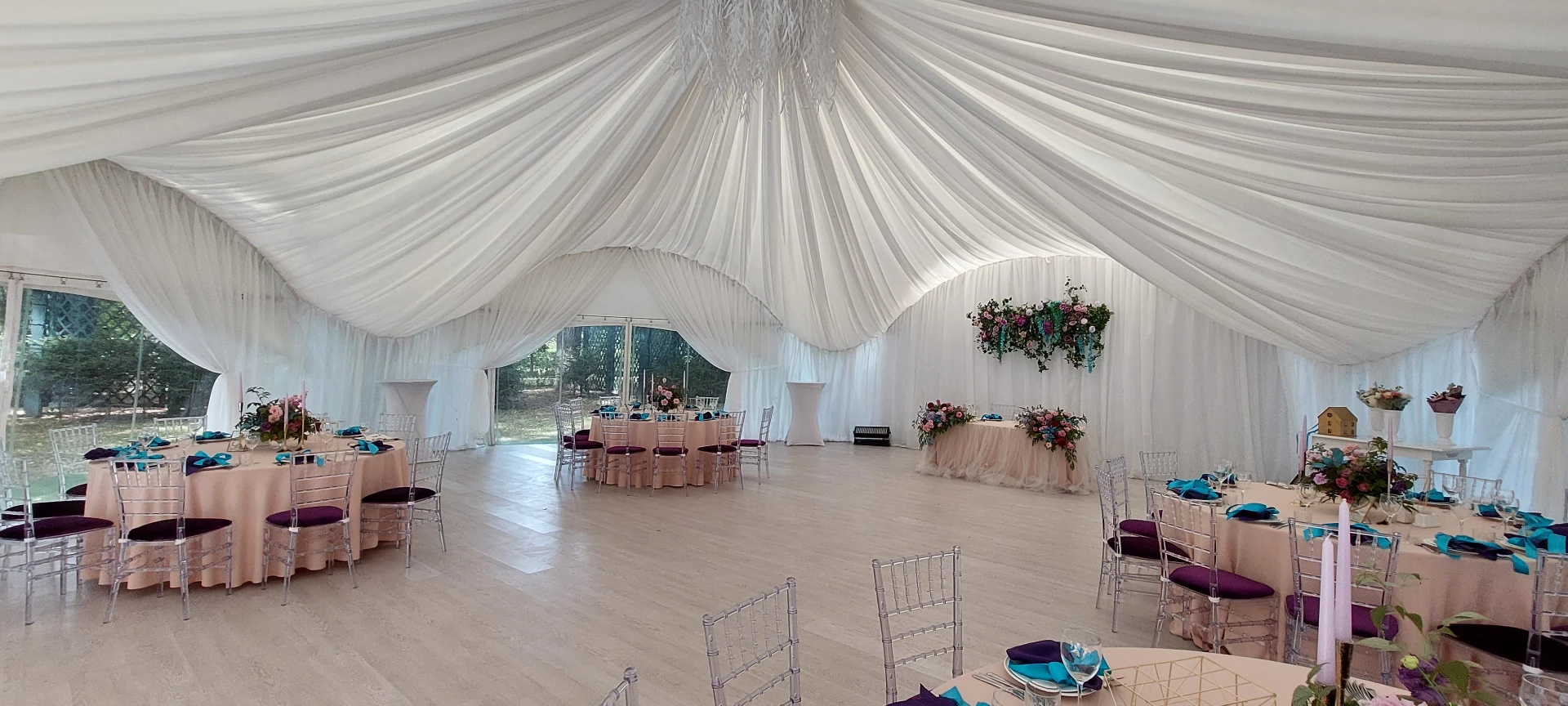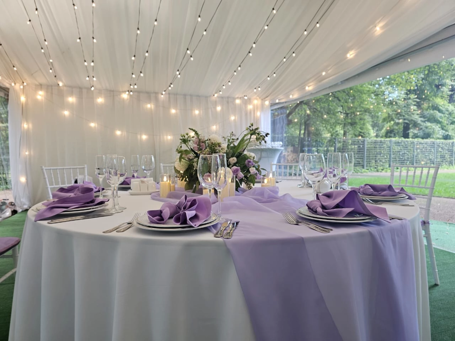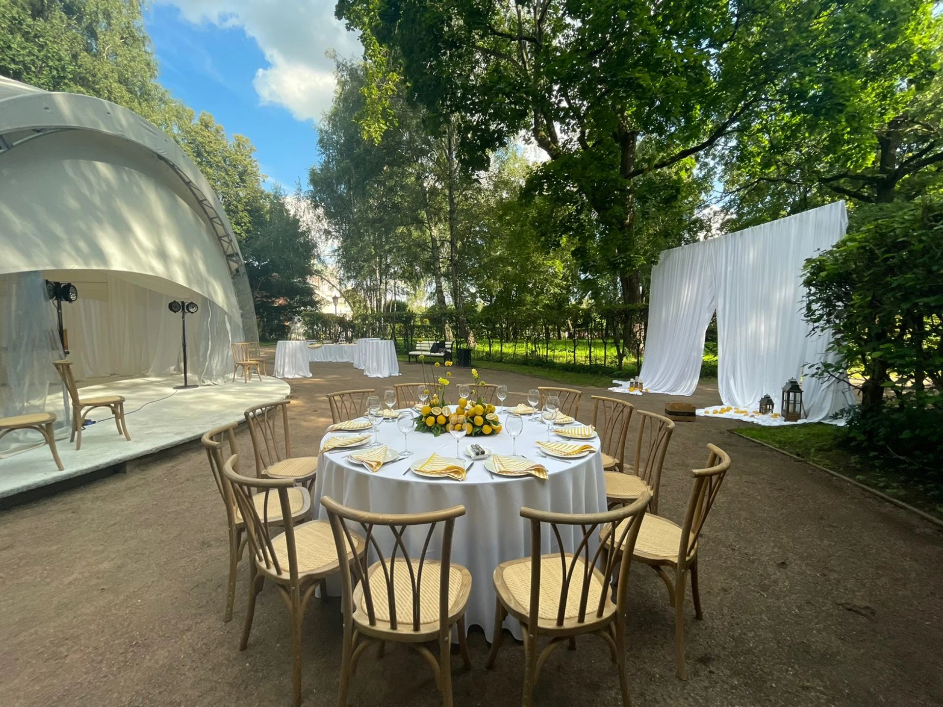 Свадьба проходила в шатре с видом на дворец. Безумно красивый шатёр, все в тканях, в белом цвете, воздушное нежное, огромная зелёная территория, все было чудесно и вкусно! Спасибо огромное