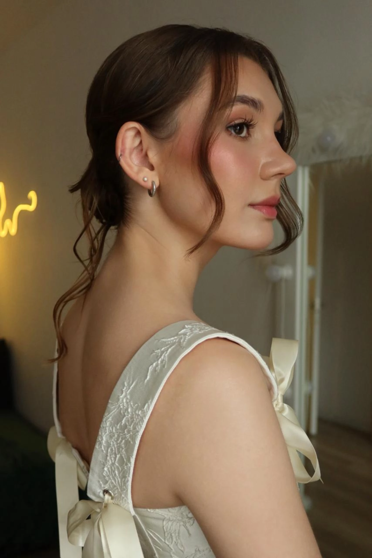 Альбина учла каждую деталь: макияж лёгкий, сияющий, идеально подобран под платье и украшения. Локоны продержались до самого вечера, даже несмотря на активные и объятия.