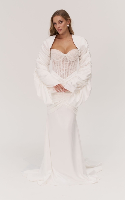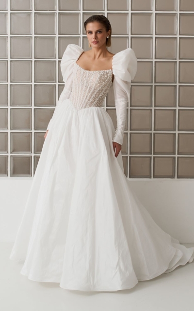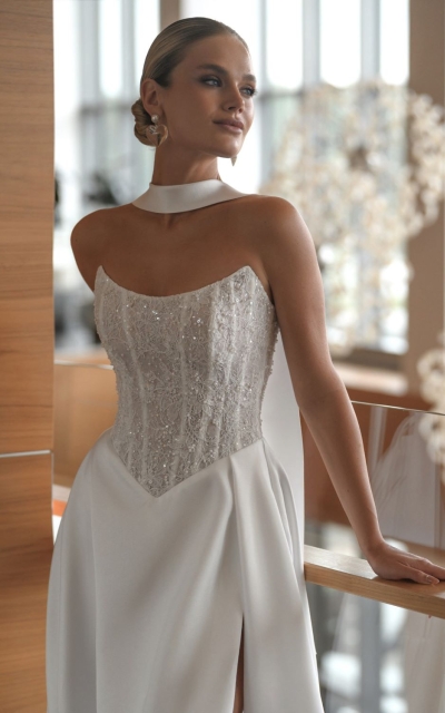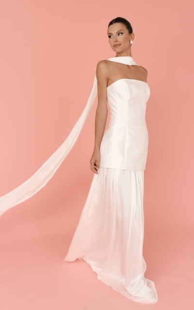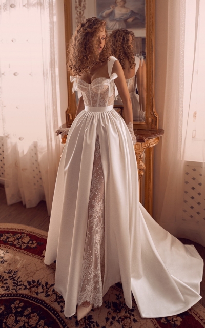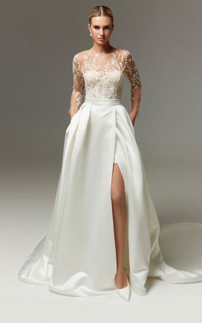 - Ампир. Талия завышается искусственно, что зрительно удлиняет ноги. В платьях для невесты стиля ампир внимание приковано к лифу.