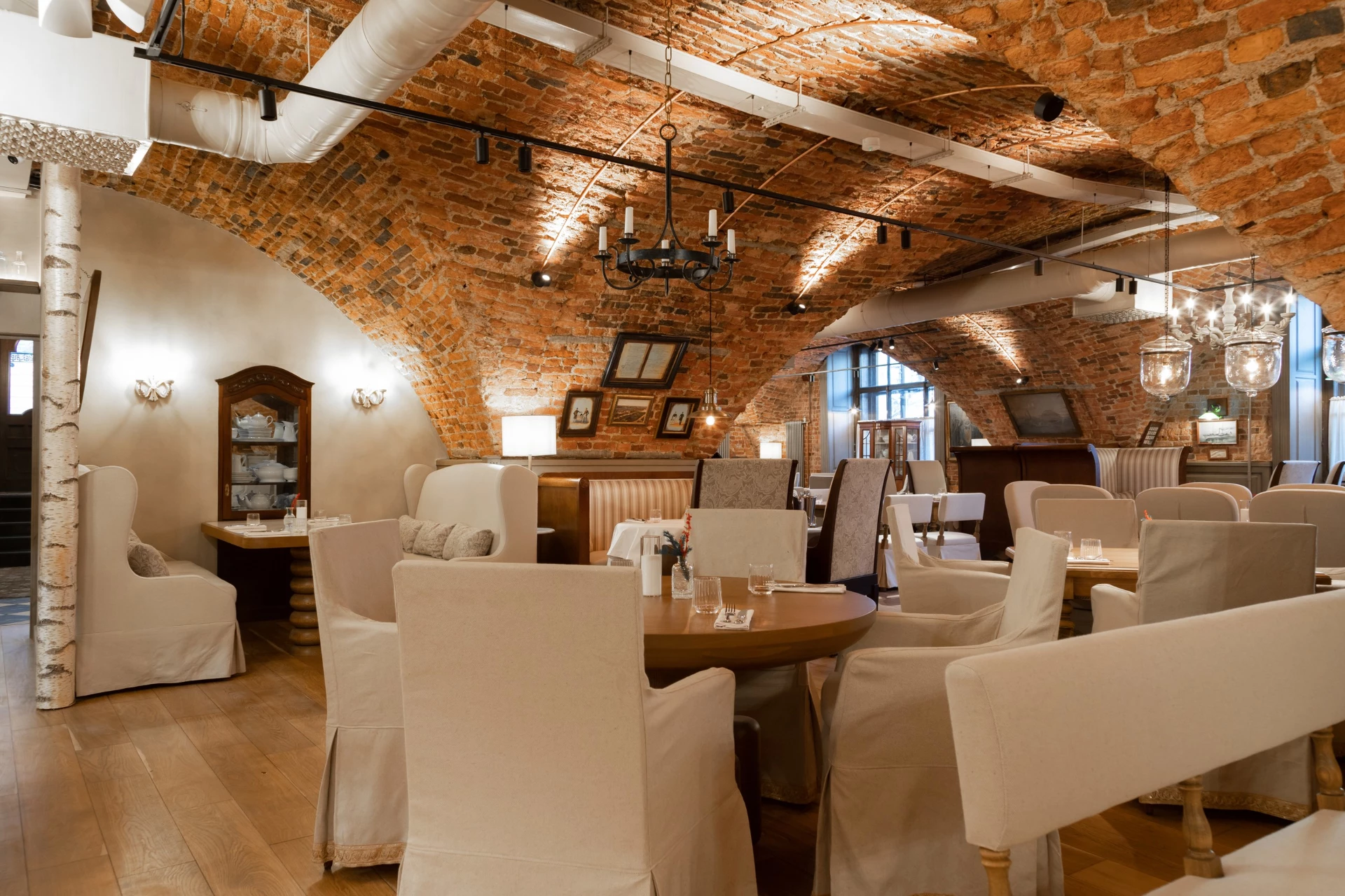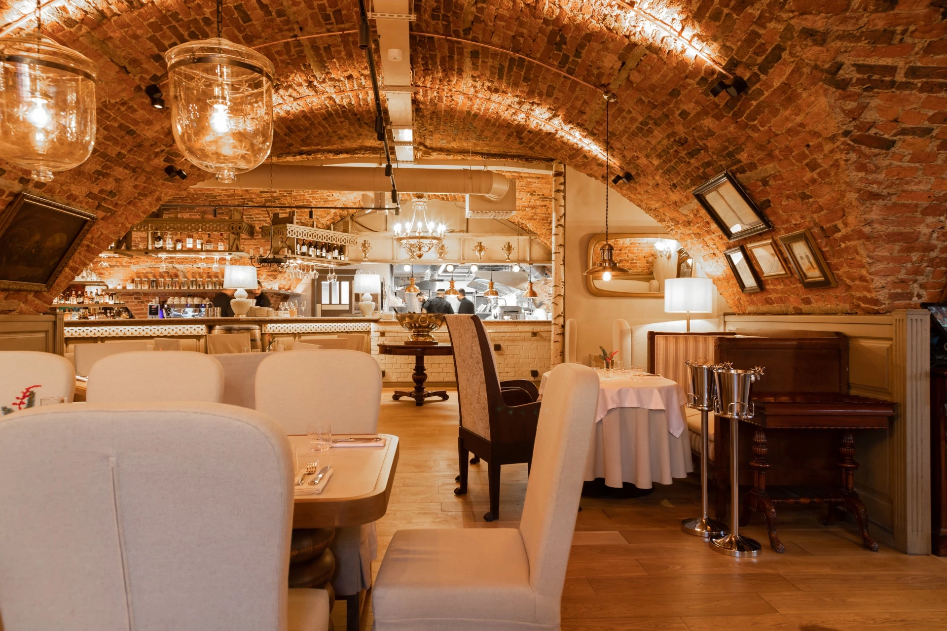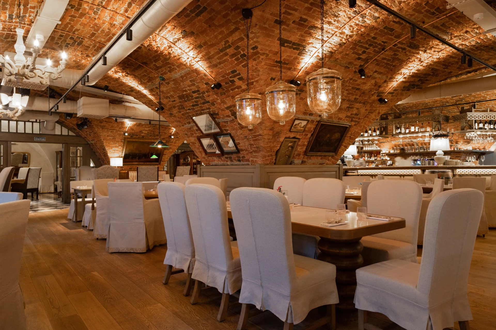 В интерьере сохранился сводчатый потолок и кирпичная кладка, барная стойка оформлена дереПоказать еще
