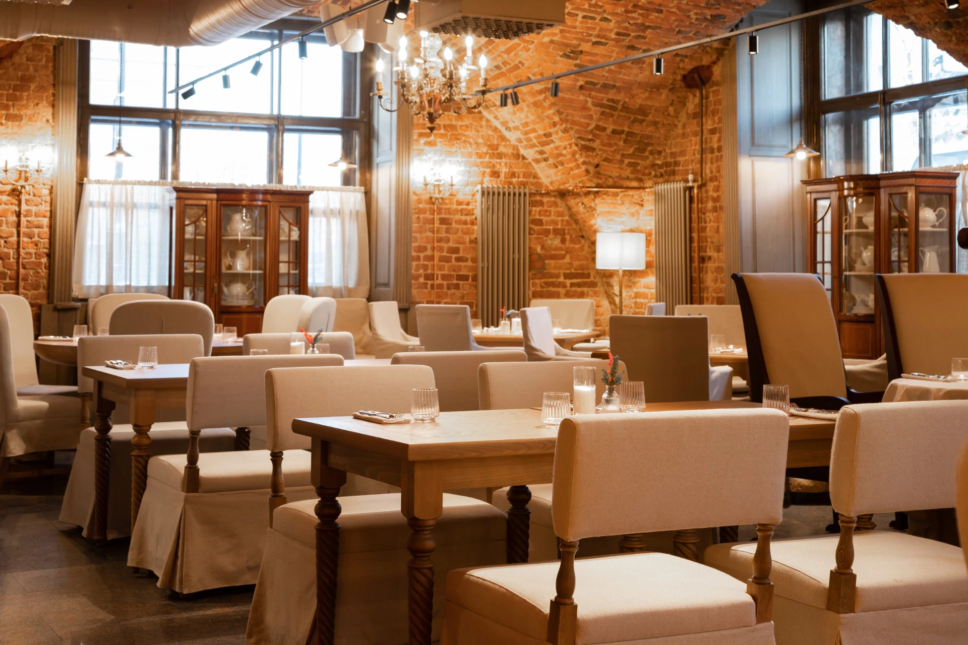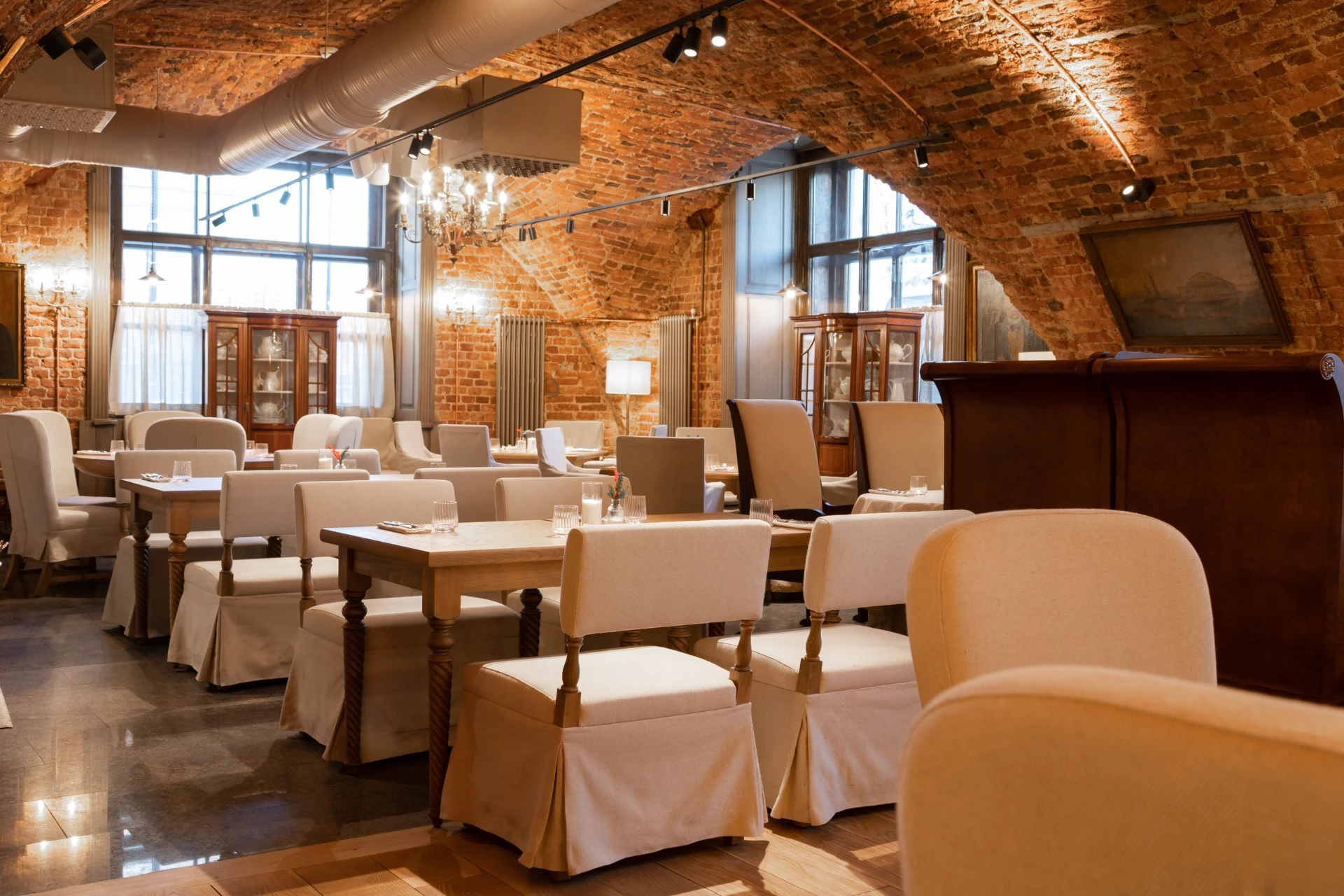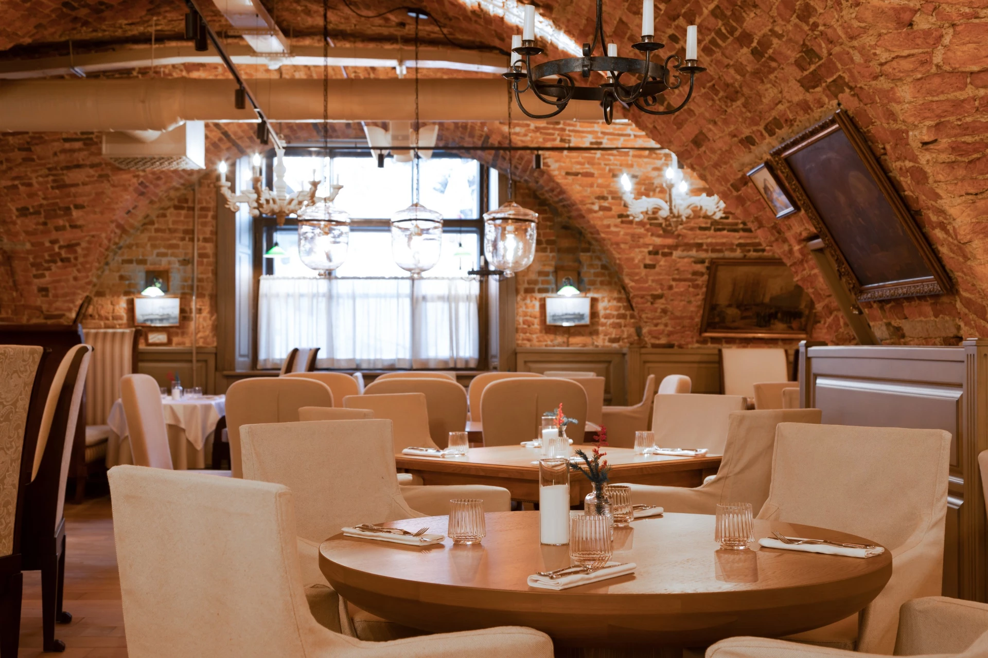 В интерьере сохранился сводчатый потолок и кирпичная кладка, барная стойка оформлена дереПоказать еще